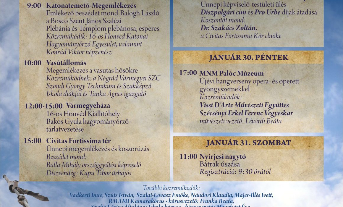 Balassagyarmat 2026. január 29. Civitas Fortissima Díszvendég: Kapu Tibor űrhajós Január 29. csütörtök 9:00 Katonatemető – Megemlékezés Emlékező beszédet mond: Balogh László a Bosco Szent János Szalézi Plébánia és Templom […]
