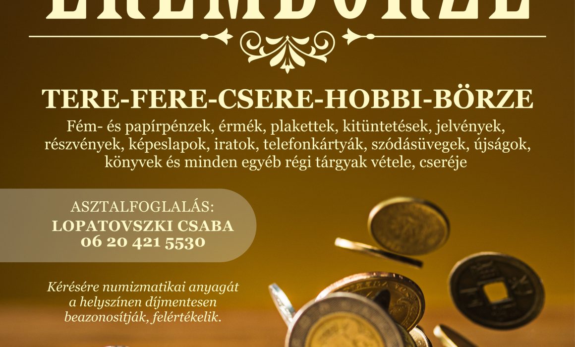 2025. november 16. 8:00-12:00 Horváth Endre Érembörze Tere-fere-csere-hobbi-börze Fém- és papírpénzek, érmék, plakettek, kitüntetések, jelvények, részvények, képeslapok, iratok, telefonkártyák, szódásüvegek, újságok, könyvek és minden egyéb régi tárgyak vétele, cseréje Asztalfoglalás: […]