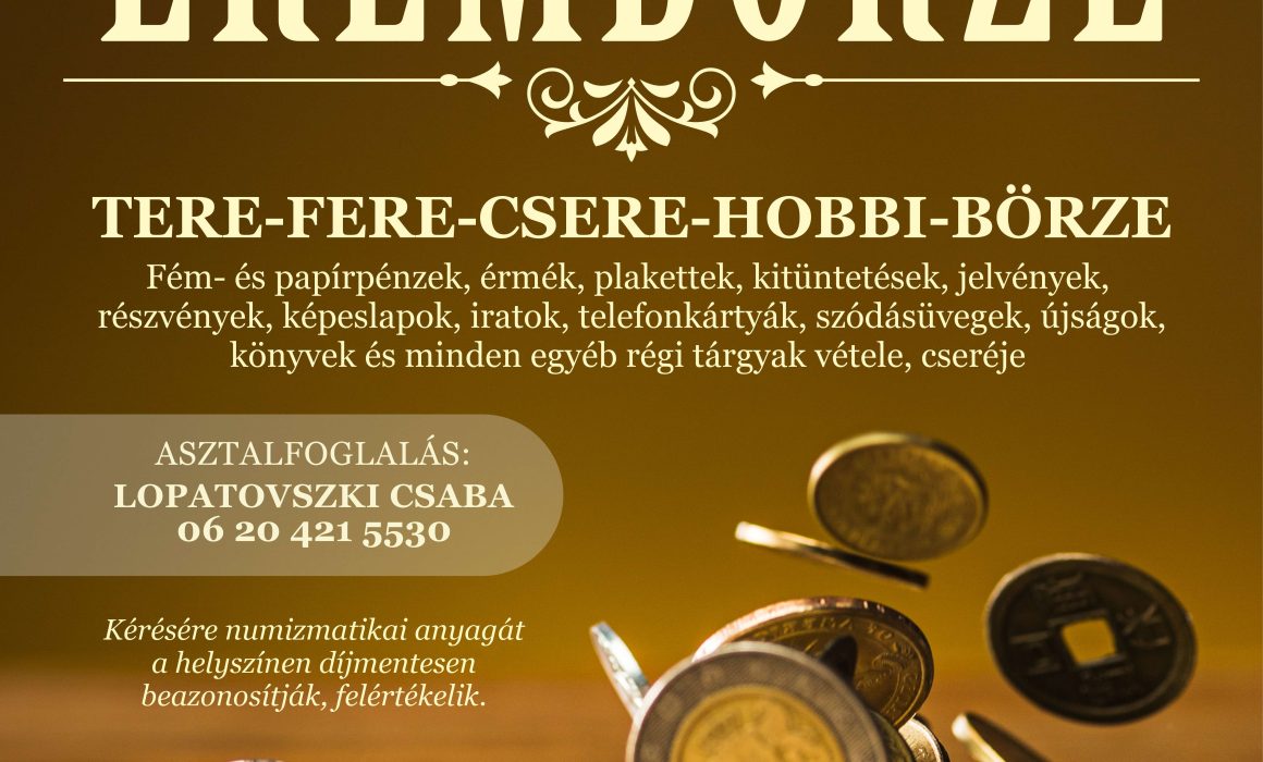 2026. ÁPRILIS 19. 9:00 – 13:00 – HORVÁTH ENDRE – ÉREMBÖRZE TERE-FERE-CSERE-HOBBI-BÖRZE FÉM- ÉS PAPÍRPÉNZEK, ÉRMÉK, PLAKETTEK, KITÜNTETÉSEK, JELVÉNYEK, RÉSZVÉNYEK , KÉPESLAPOK, IRATOK, TELEFONKÁRTYÁK, SZÓDÁSÜVEGEK, ÚJSÁGOK, KÖNYVEK ÉS MINDEN EGYÉB […]