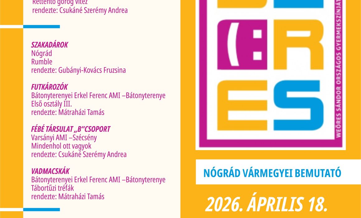 Weöres Sándor Országos Gyermekszínjátszó Találkozó Nógrád Vármegyei Bemutató 2026. április 18. szombat 9:30 Mikszáth Kálmán Művelődési Központ, Balassagyarmat Játékkuckó Magyarnándori Általános Iskola – Magyarnándor Kolontos Palkó rendezte: Györösiné Gyöngyösi Veronika […]