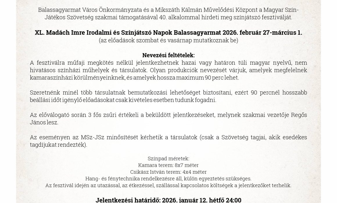 JELENTKEZÉSI LAP LETÖLTÉSE XL. ISZN Balassagyarmat 2026 FELHÍVÁS Balassagyarmat Város Önkormányzata és a Mikszáth Kálmán Művelődési Központ a Magyar Színjátékos Szövetség szakmai támogatásával 40. alkalommal hirdeti meg színjátszó fesztiválját. XL. […]