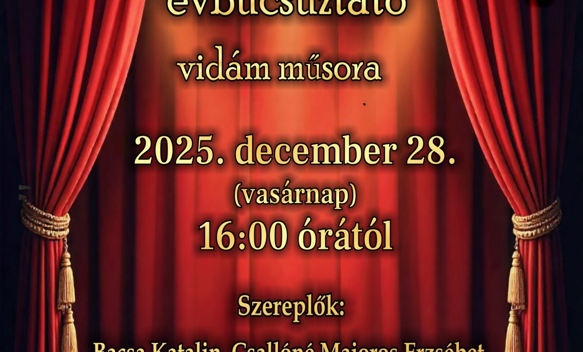 Gyarmati Színkör évbúcsúztató vidám műsora 2025. december 28. (vasárnap) 16:00 órától Szereplők: Bacsa Katalin, Csallóné Majoros Erzsébet, Cseri Lászlóné, Illés Orsolya, Pusztai Éva, Fábry István, Kalmár Attila, Rácz Imre, Sztancsik […]